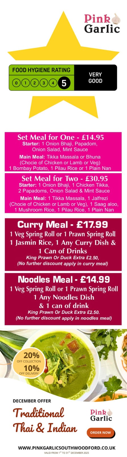 We are proud to present the finest chef in the culinary world. The management takes great care to ensure that our diners are happy with the food. We pride ourselves on our customer service and quality of food. PINK GARLIC SOUTH WOODFORD uses only the very best ingredients to prepare your meal. In addition to the all time favourite dishes, we also offer our own specialities creating unique meals for you to enjoy. PINK GARLIC SOUTH WOODFORD is an Authentic Cuisine in LONDON, tempted by an unrivaled range of Authentic & Imaginative traditional and fusion dishes. Our approach to healthy cooking is that we try to minimize additives in our dishes. So enjoy your meal & have a memorable experience!!